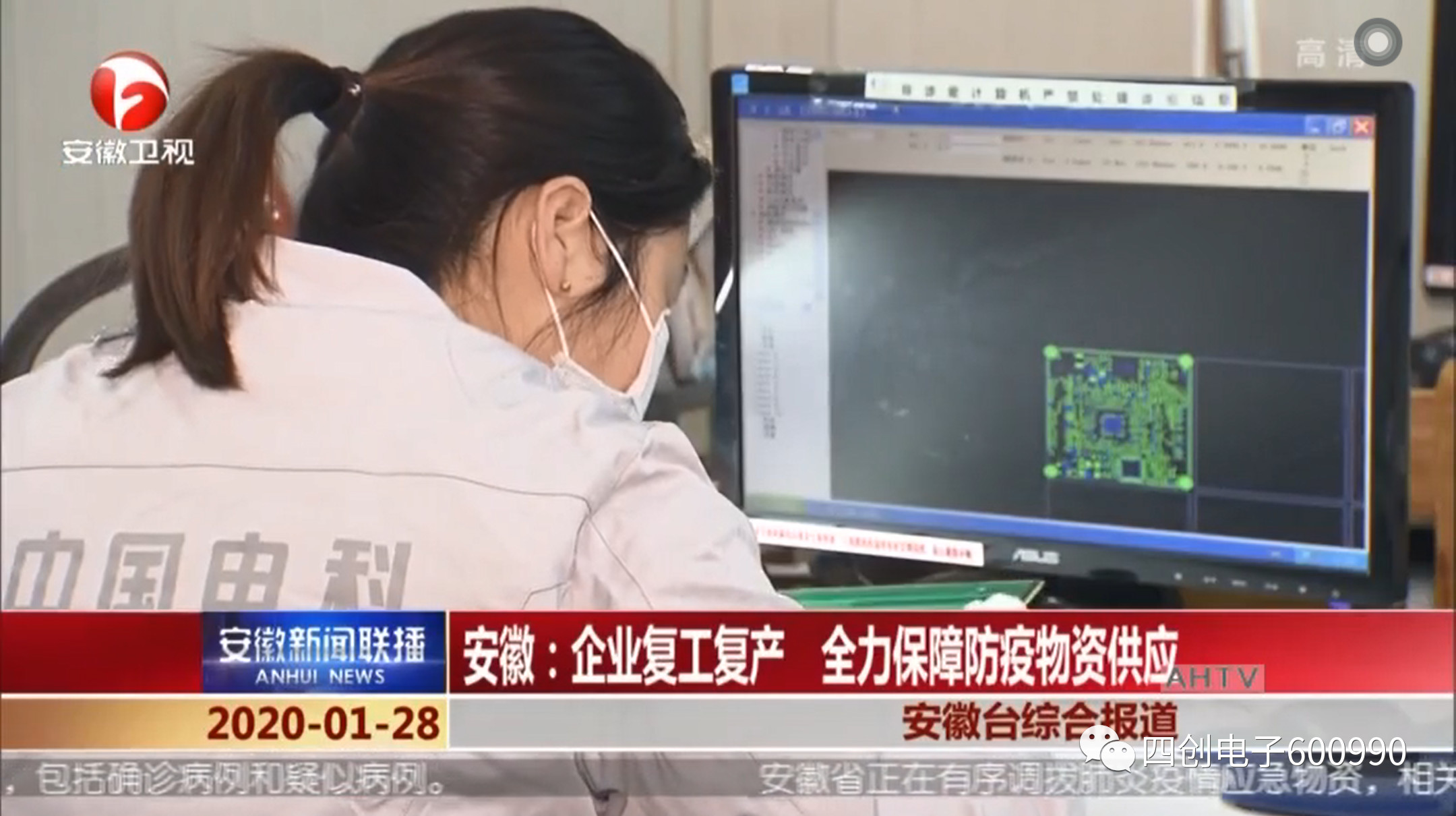 1月28日,安徽新聞聯(lián)播作了題為《安徽企業(yè)復(fù)工復(fù)產(chǎn) 全力保障防疫物資供應(yīng)》的專題報(bào)道,報(bào)道中介紹了四創(chuàng)電子精密電路事業(yè)部全力投入抗擊新型冠狀病毒肺炎的監(jiān)測(cè)設(shè)備配套生產(chǎn)任務(wù)的情況。報(bào)道部分內(nèi)容如下: