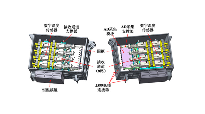 8路KA波段接收通道,放大濾波后直接檢波形成檢波電壓輸出送給后端采樣及信號處理電路,具有恒溫功能保證接收通道的幅度相位穩(wěn)定。