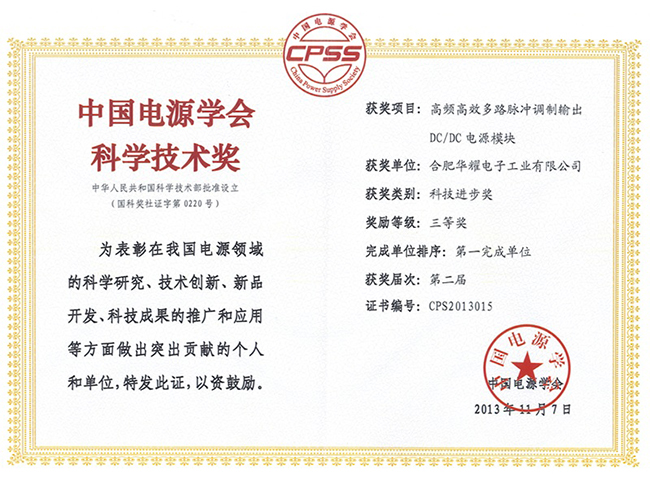 中國(guó)電源學(xué)會(huì)是國(guó)家一級(jí)學(xué)會(huì),也是目前國(guó)內(nèi)電源行業(yè)唯一的全國(guó)性行業(yè)組織。中國(guó)電源學(xué)會(huì)科技進(jìn)步獎(jiǎng)是由國(guó)家批準(zhǔn),在全國(guó)范圍內(nèi)評(píng)選的科技獎(jiǎng)勵(lì)。2013年全國(guó)僅13個(gè)電源項(xiàng)目獲此獎(jiǎng)項(xiàng)。
